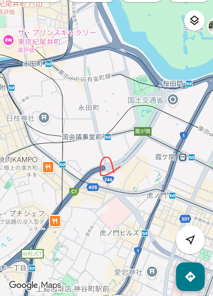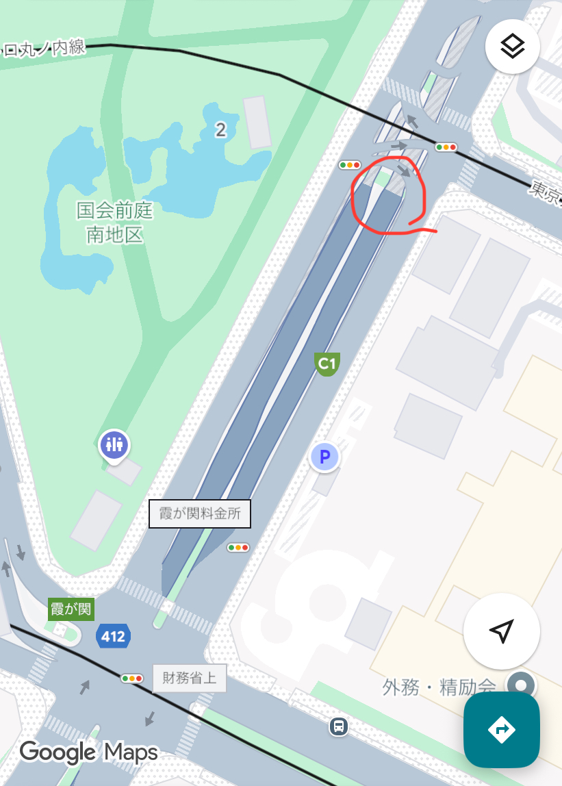 そのため、この向きで見ると右側にある首都高の「霞が関(北池袋や中央道方面)」入口に入るには、ここを一旦左折して、その先にある「内閣府下」交差点でUターンしてくると入ることができます。