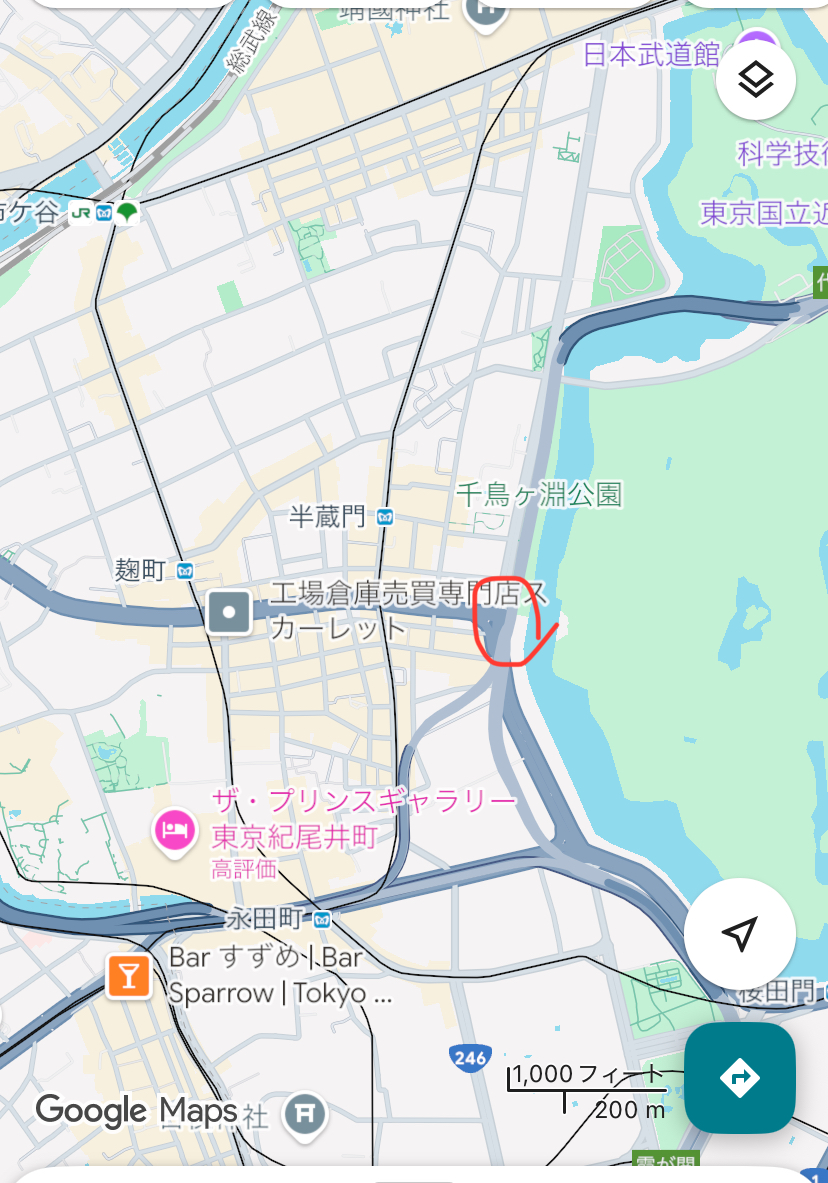 ここをルートの起点となりやすい交差点として挙げた理由は、この向きで左折すると靖国通りを使って九段下方面に行きやすいからです。