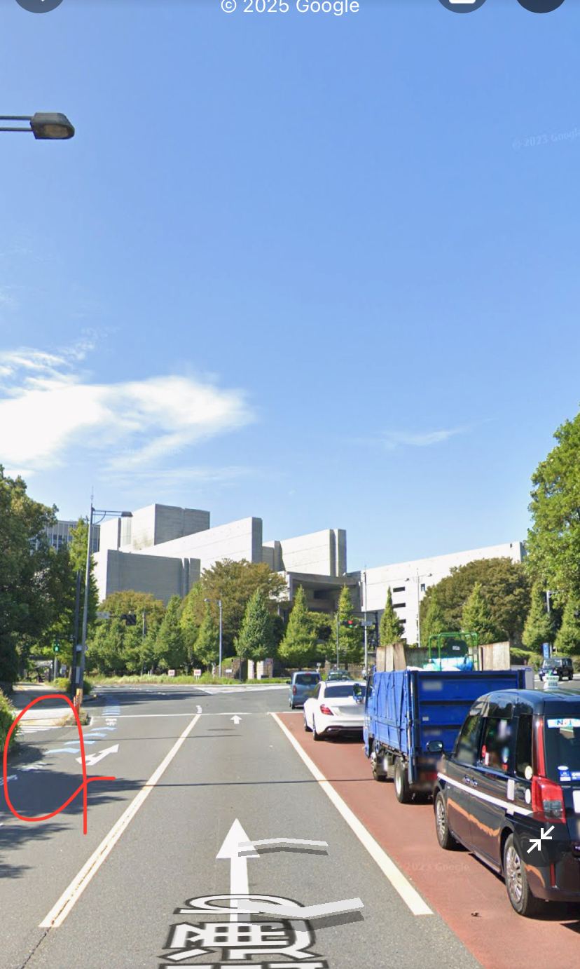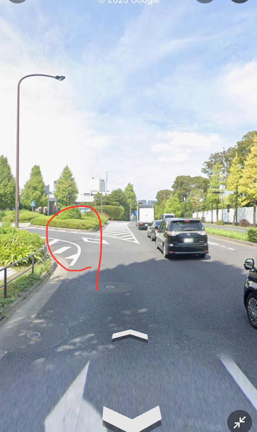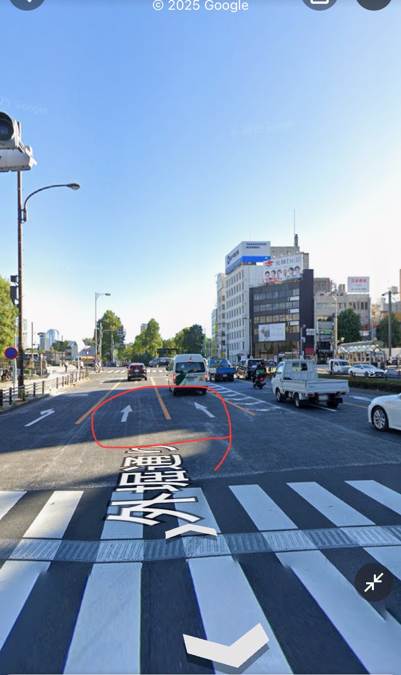 この画像の赤丸のように、右から2番目の車線は直進専用レーンになっていて、一番右車線のみ右折専用レーンとなっています。
