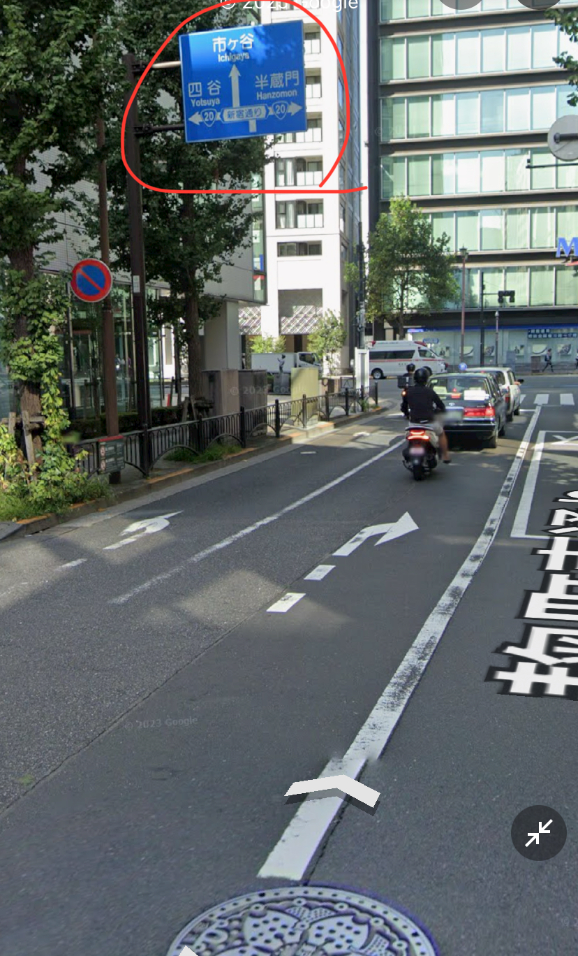 ここは左折レーンと右折レーンの2車線なのですが、上記画像の赤丸の青い看板のとおり、市ヶ谷方面(日本テレビ通り)に行きたい場合は、ここを左折した先にある「麹町四丁目」交差点のもう一つの信号を右折しましょう。