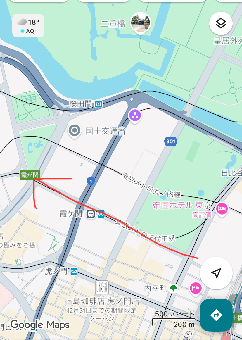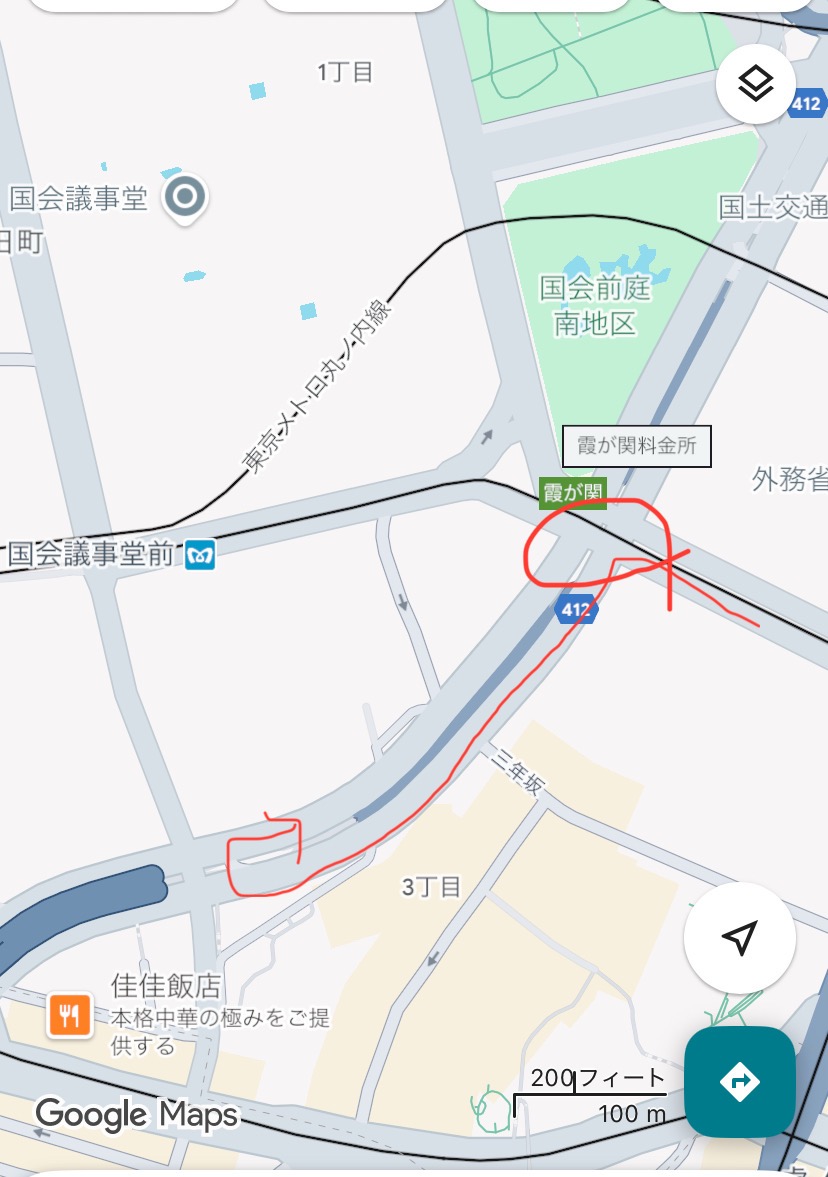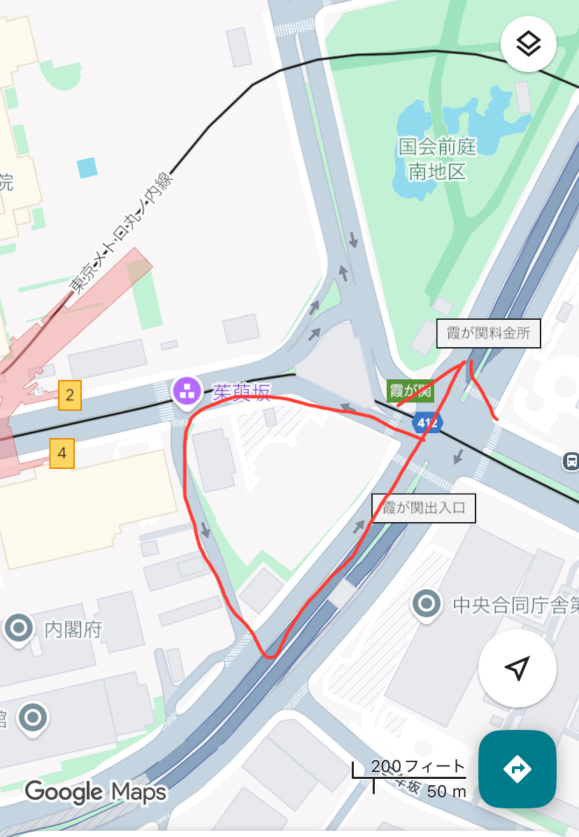 戻ってきたら、内幸町方面へ行きたい場合は左折、「霞が関」から首都高に乘りたい場合は直進すればOKです。