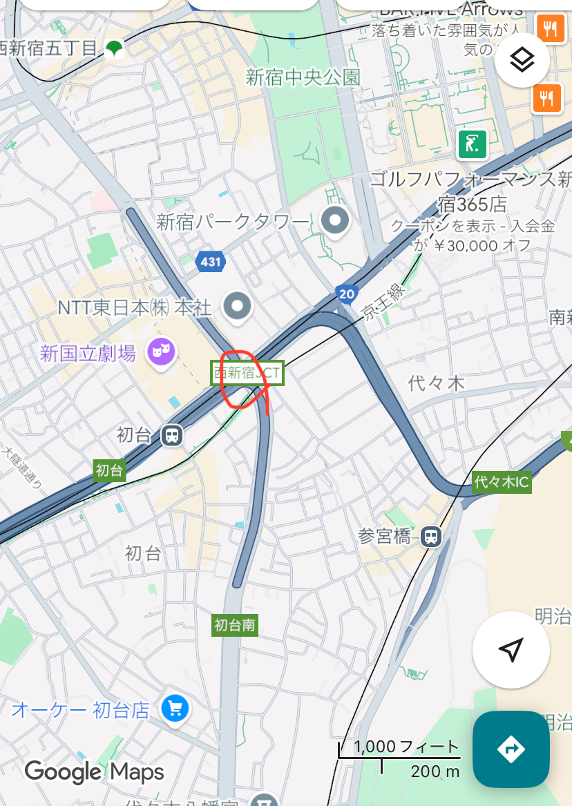 先ほど紹介した、上記画像の山手通りを中野坂上側から中目黒方面に走る向きで「初台」交差点に入り、ここを直進して「初台南」に向かうほうがいいかなと感じています。