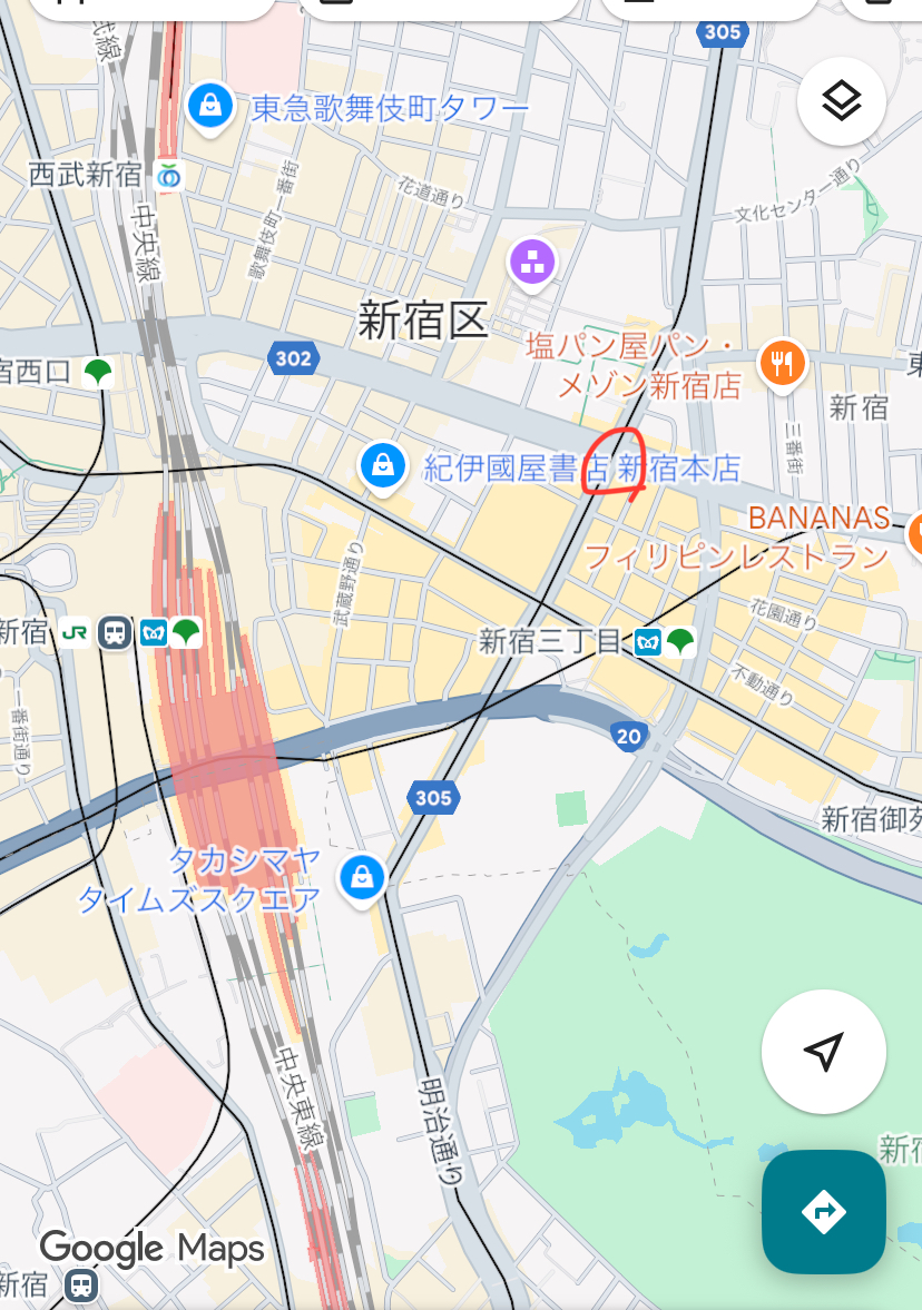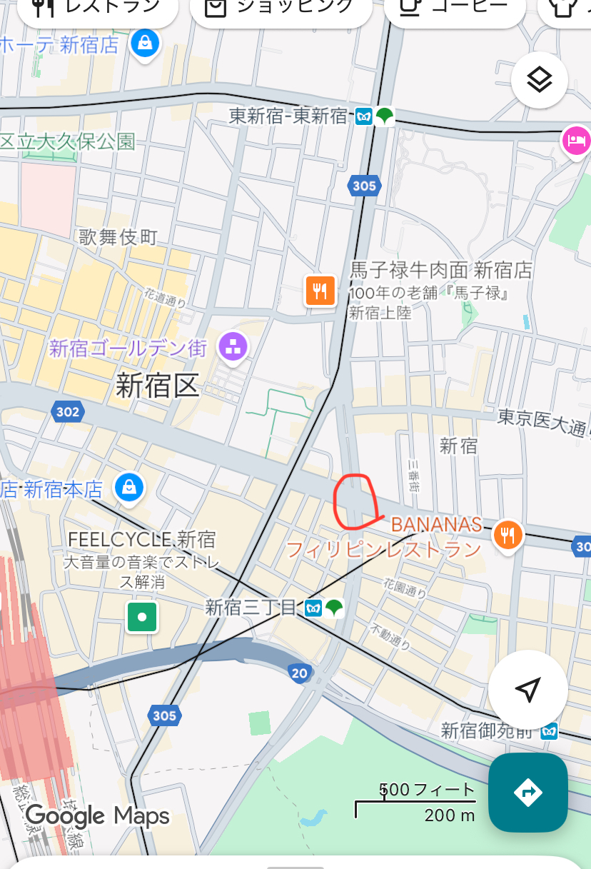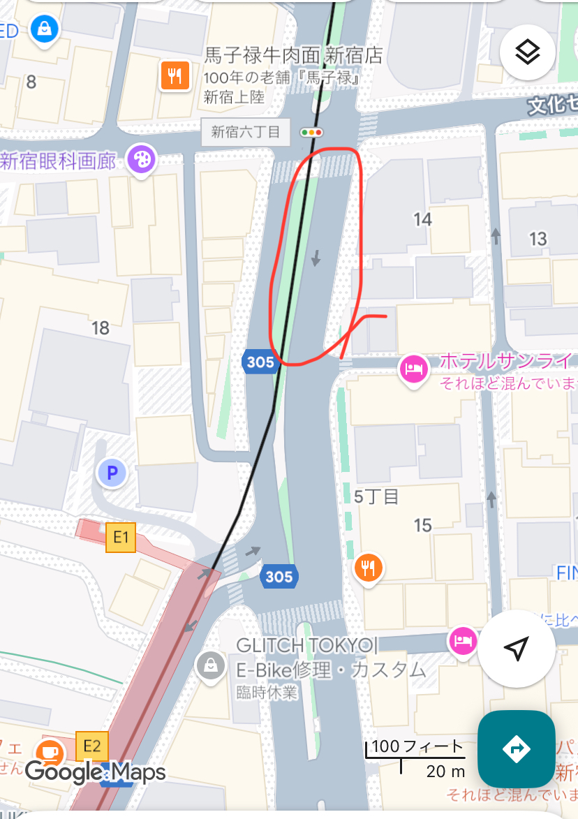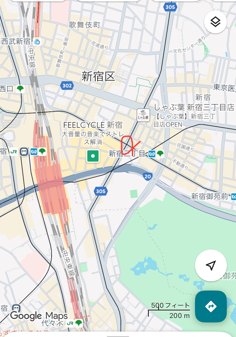 そうすると、「新宿五丁目」ではなく、「新宿五丁目東」交差点に入れます。