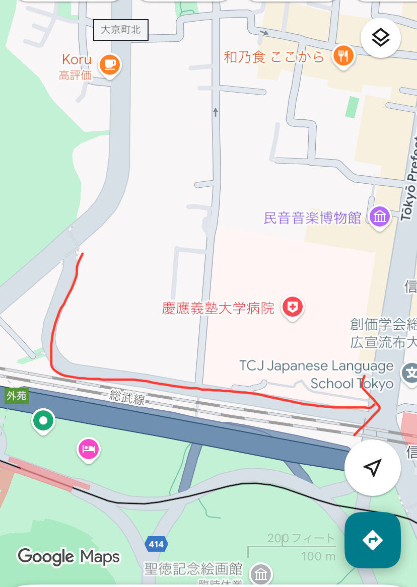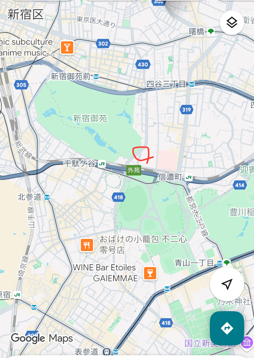 上記画像のように、「大京町」交差点を左折して道なりに進むと外苑東通りにつながるので、そこ(「信濃町駅前」交差点)を右折して六本木に向かうとスムーズに行くことができます。