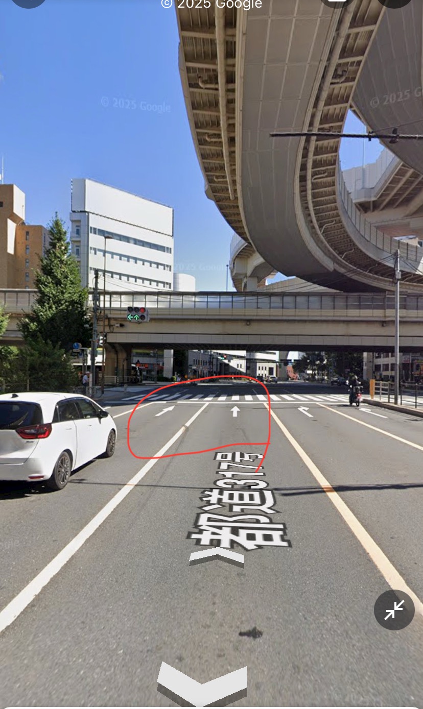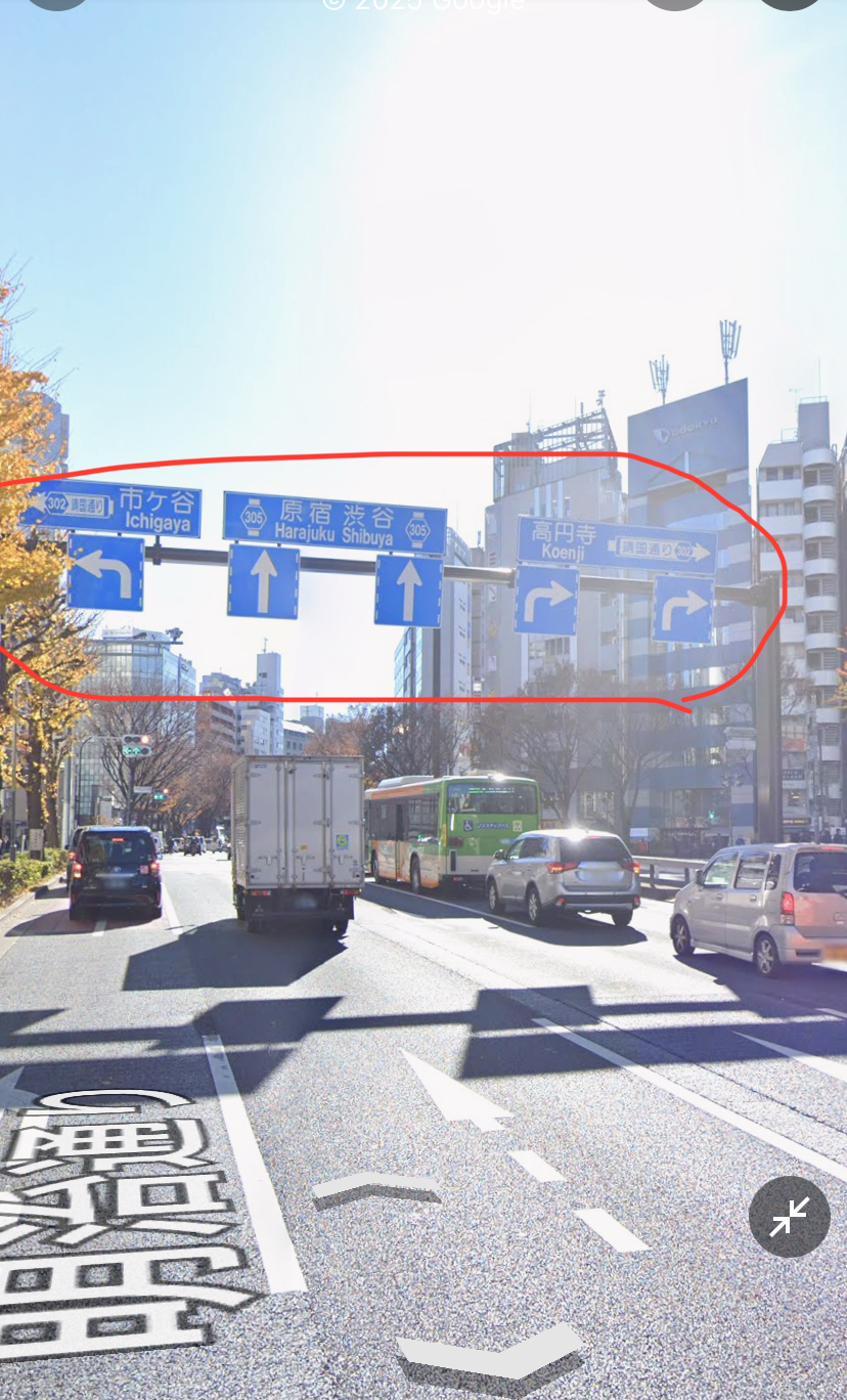 上記画像は、山手通りを中野坂上側から中目黒方面へ走っている様子ですが、この画像でいうと、