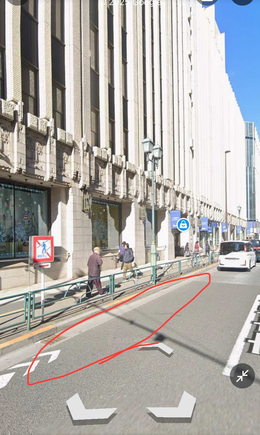 交差点付近の切れ目など伊勢丹の入口に近いところで降りていただいてから、この場所に移動して待機をしましょう。